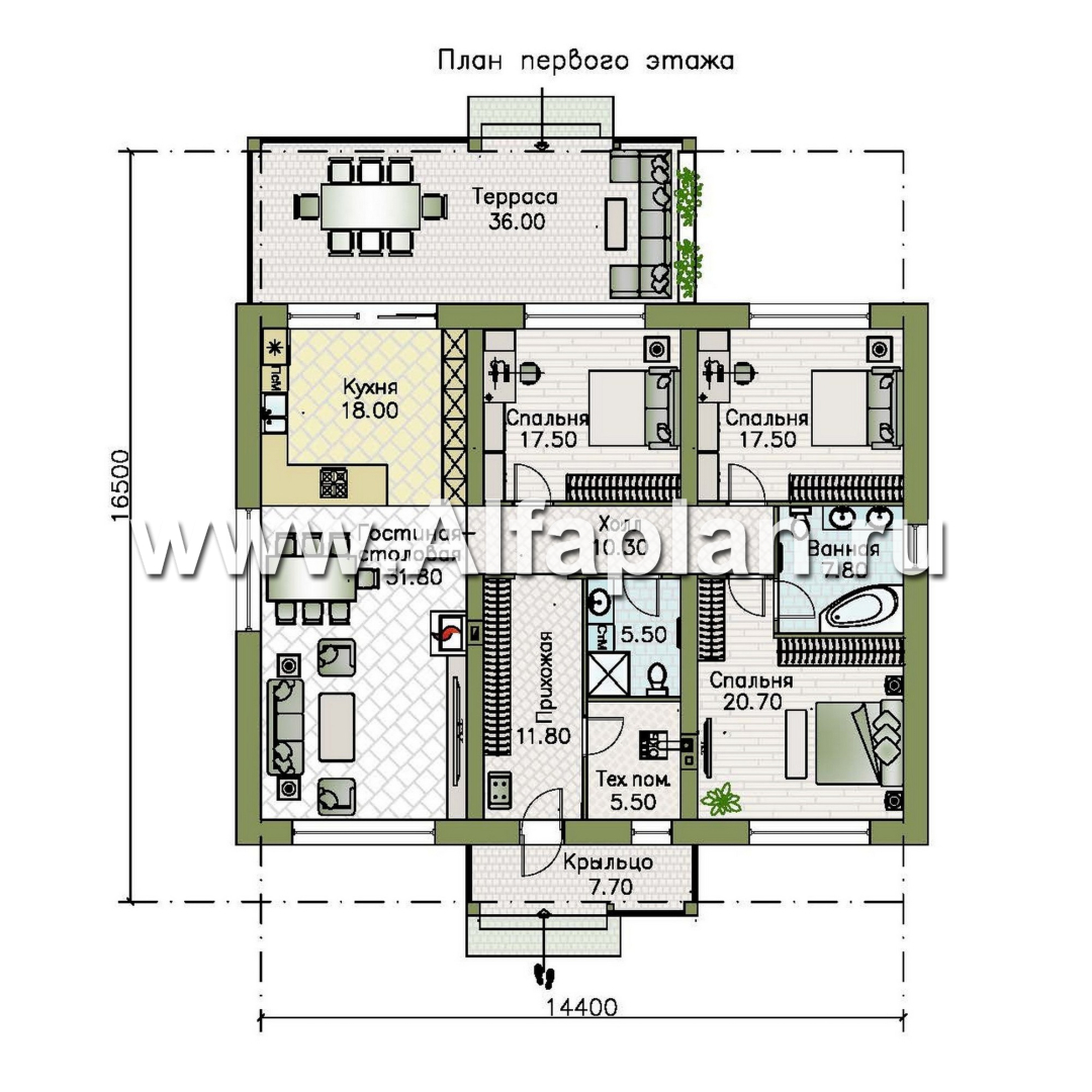 «Стрелец» -проект современного одноэтажного дома с террасой со стороны входа, с односкатной крышей - технические характеристики