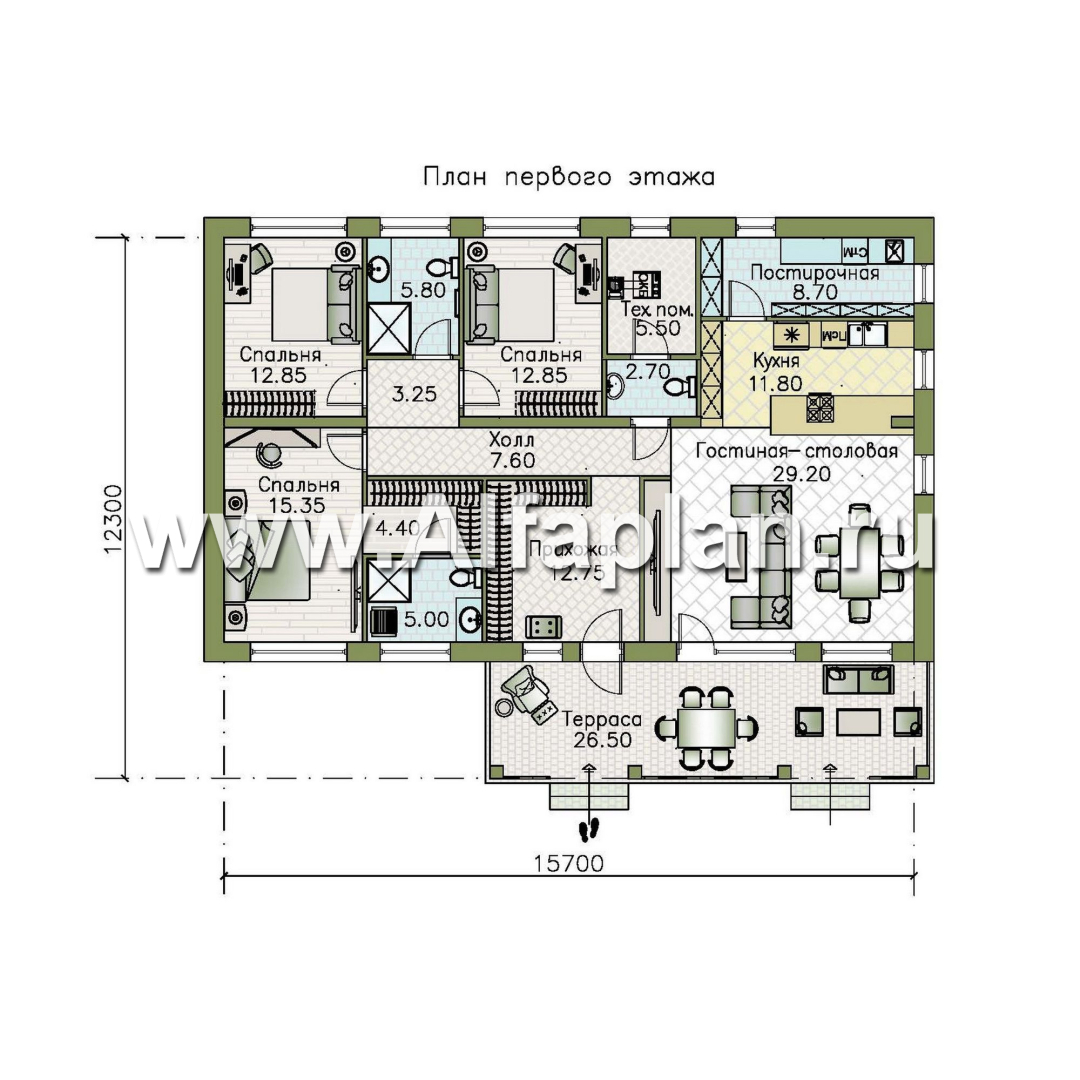 «Золотые поля» - проект одноэтажного дома, планировка мастер спальня и две детских, терраса со стороны входа