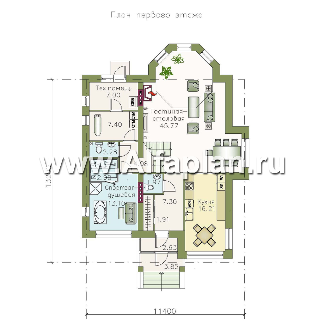 На входе в загородный дом — большая прихожая с гардеробной. Гостиная-столовая имеет площадь 46м2, и украшена большим трехгранным эркером, который позволяет создать неповторимый интерьер. Кухня имеет вытянутую форму, и поэтому, возле окна, можно расположить отдельный столик для завтраков.