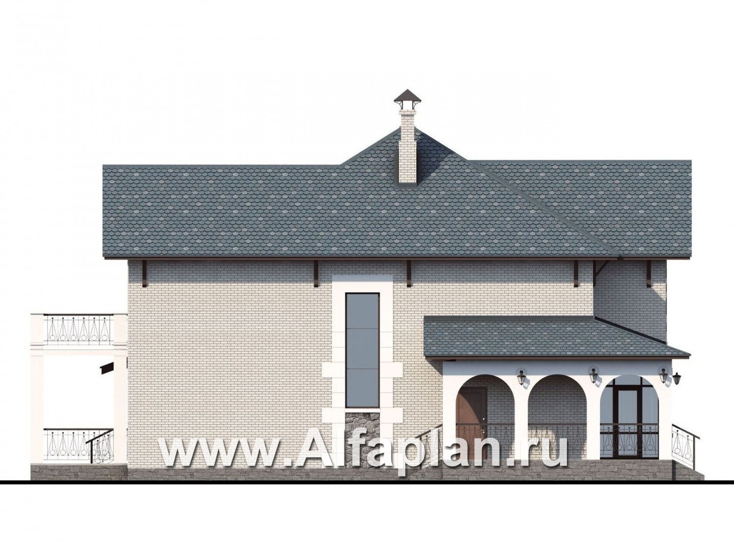 Рифмующийся рисунок арок, светлые оштукатуренные поверхности, большие панорамные окна, кованые элементы – стилизованные  фонари и ажурное лестничное ограждение – вносят в облик этого дома из кирпича (газобетона) нотку  респектабельности, элегантности и изящества.