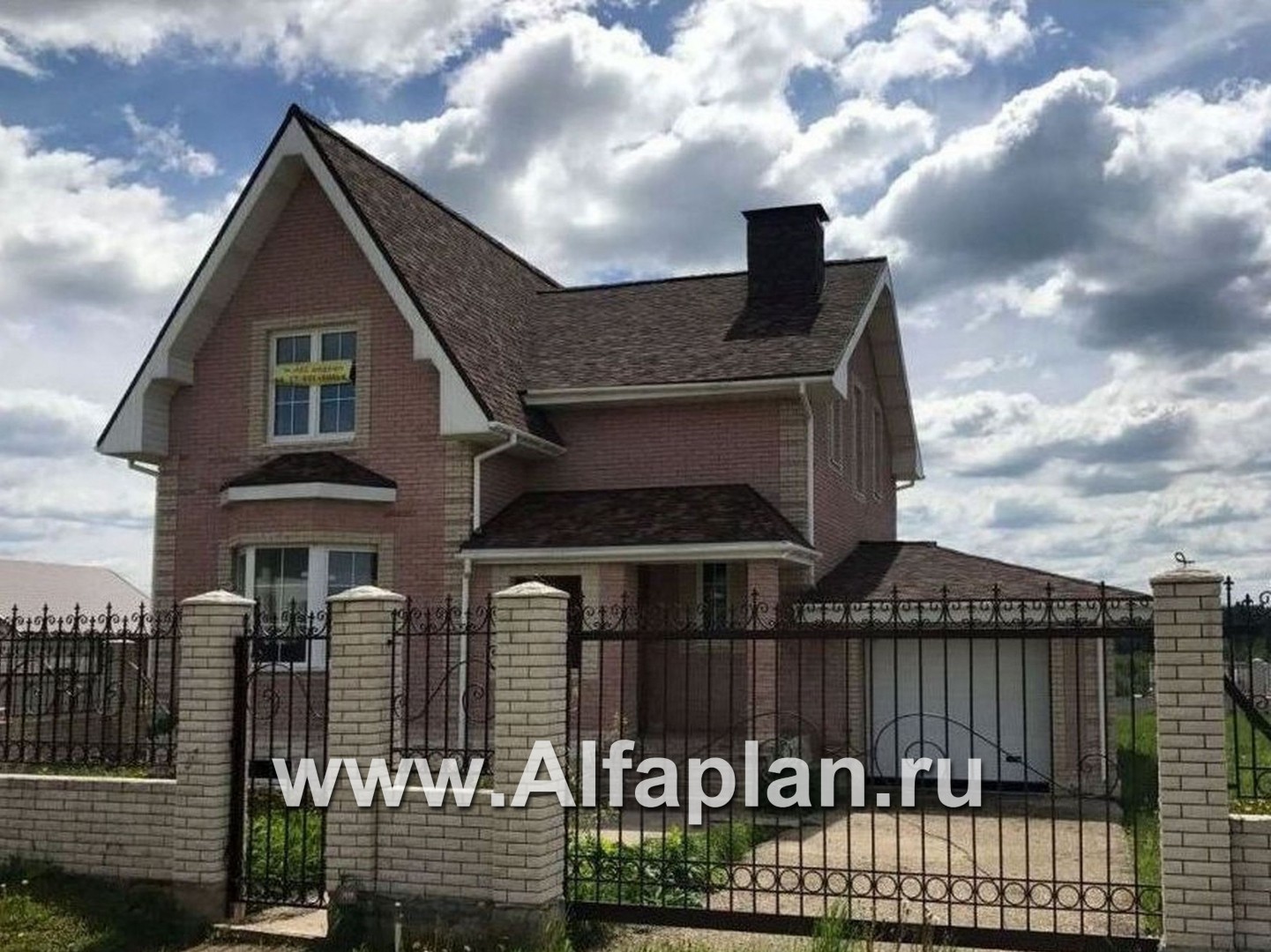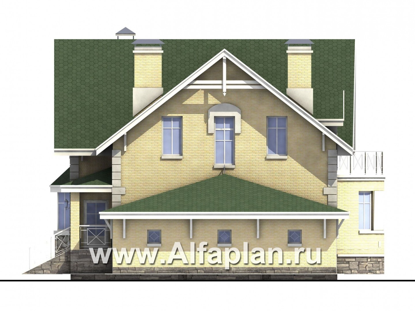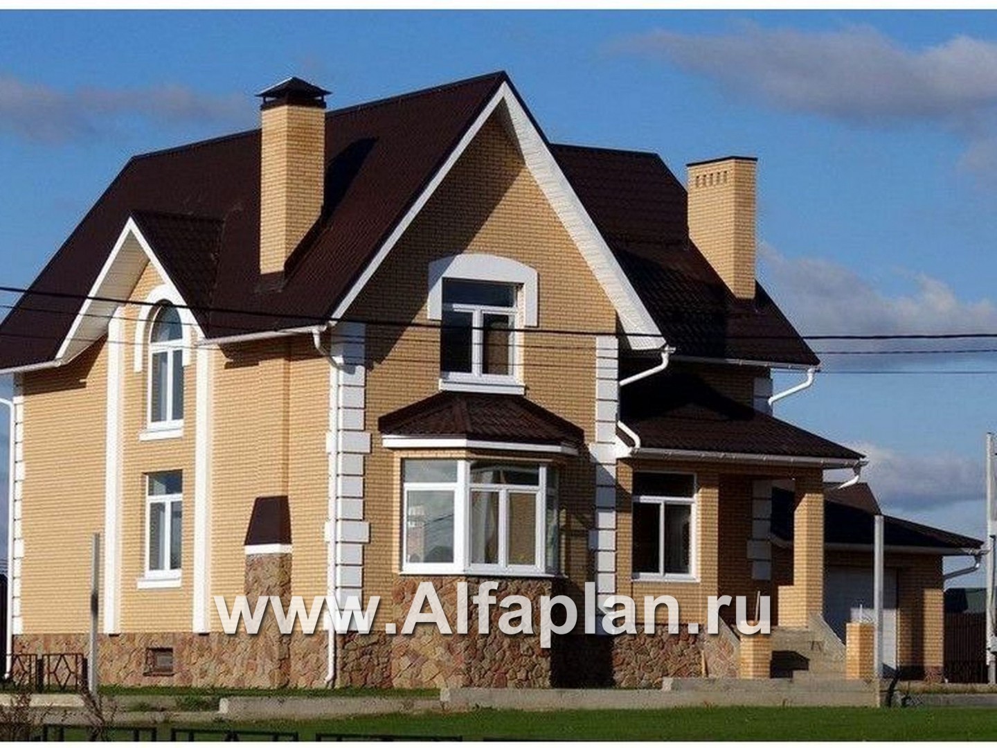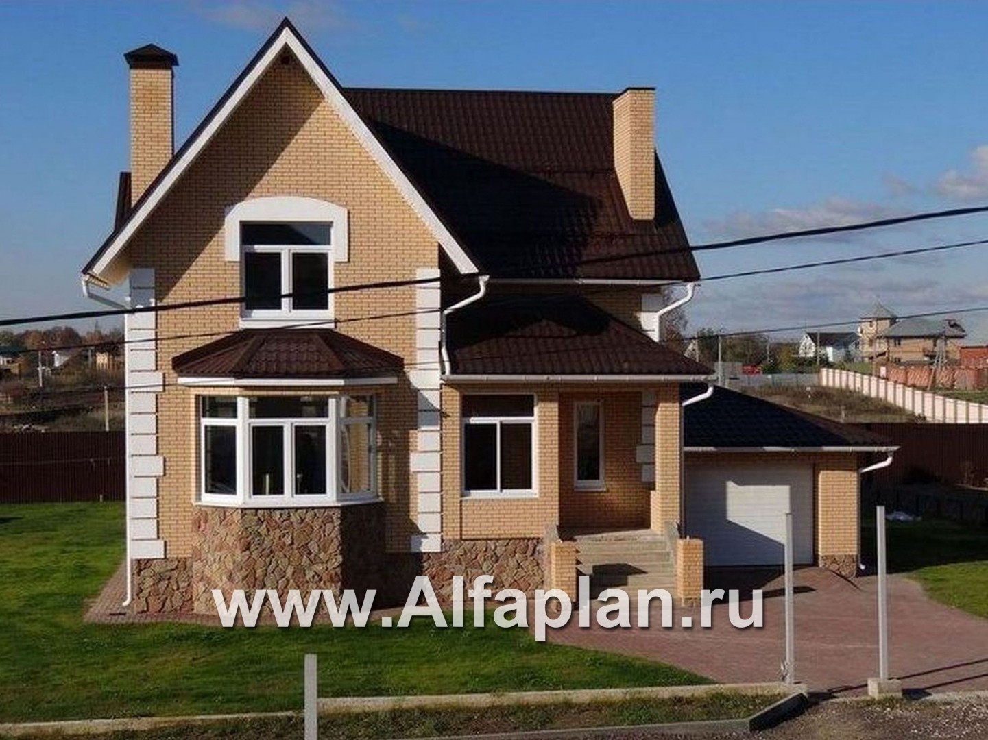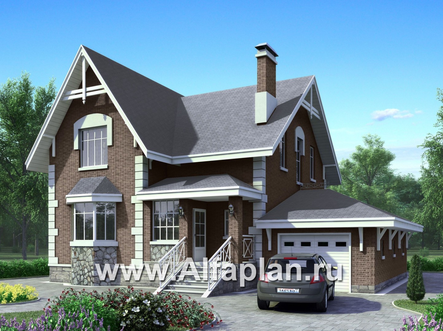 Дом двухэтажный с мансардной кровлей. Украшением дома являются эркеры на главном и садовом фасадах. Дом представляет собой компактный объем, с прекрасным функциональным зонированием в плане. Из большой, светлой прихожей можно попасть в кухню, гостиную или на лестницу. Гостиная с камином и столовой являются единым пространством, визуально разделенным двусветной частью гостиной. К столовой, размещенной в круглом эркере, примыкает кухня. На втором этаже расположены три изолированные спальные комнаты и две ванных. Из холла второго этажа открывается вид в двусветное пространство гостиной. К дому пристроен гараж, в который можно попасть по лестнице, не выходя из дома. Имеется вариант дома без гаража.