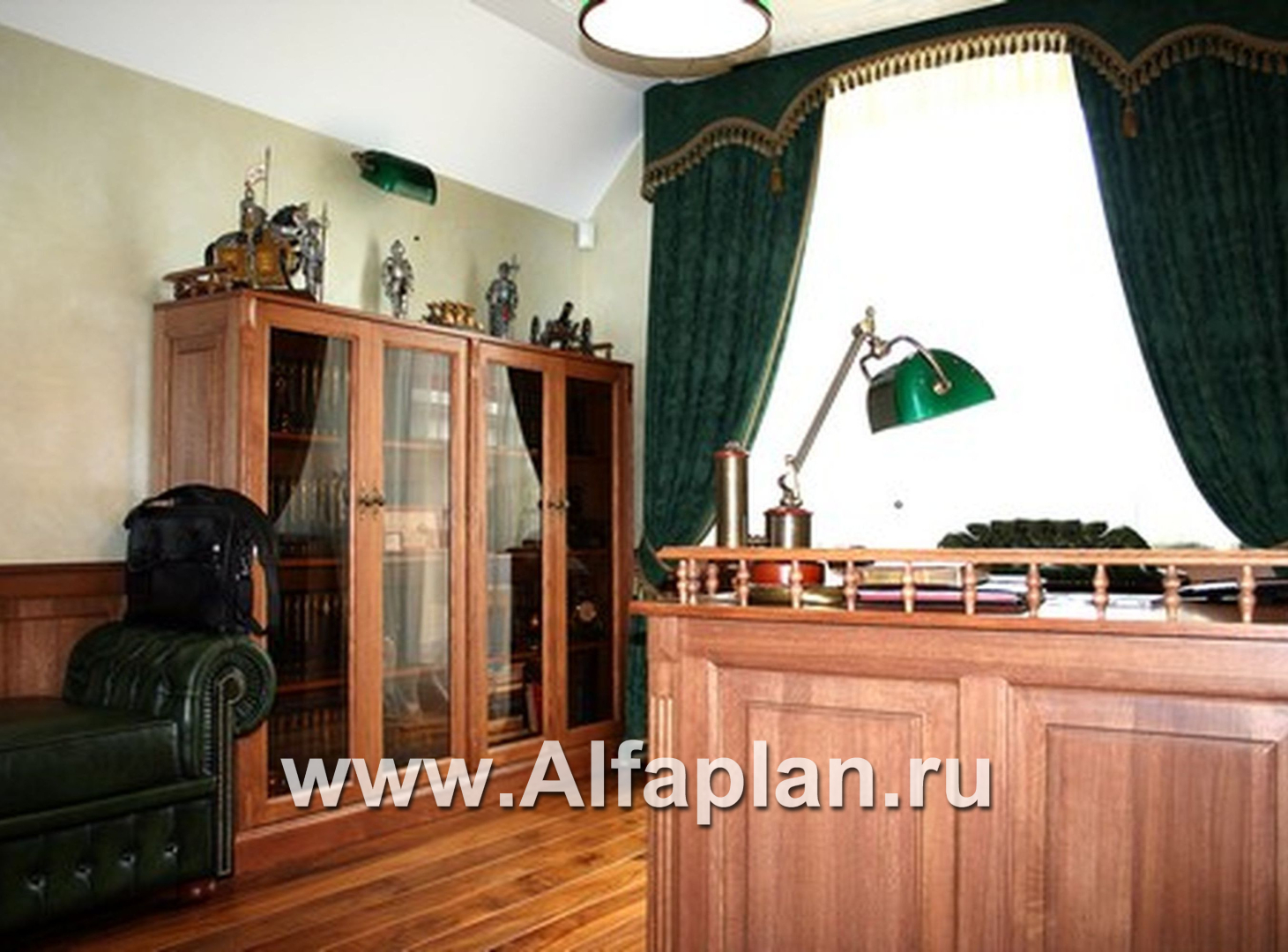 Кабинет при желании можно объединить с холлом в единое пространство, получив биллиардную или библиотеку. Холл второго этажа решен в двух уровнях, на нижнем расположены две спальни, на верхнем еще две спальни и ванная комната. Из холла открывается прекрасный вид в двусветное пространство гостиной. Одна из спален, выходящая на фасад здания, снабжена балконом. Для хорошего дневного освещения, главный фасад здания желательно ориентировать на южную сторону.