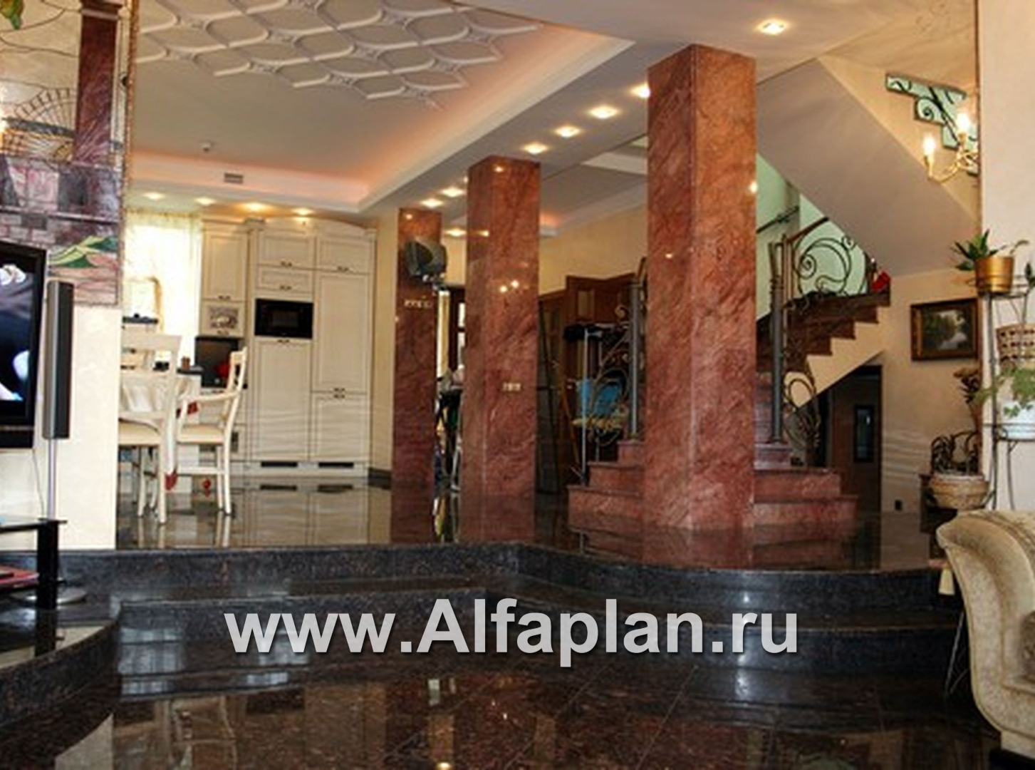 Все окна дома, а также эркер имеют однотипное обрамление. Входной блок первого этажа включает в себя тамбур и холл, проходящий через весь этаж. Из холла первого этажа можно попасть в гостиную, в кухню-столовую, на застекленную веранду или на уровень ниже, в гараж. Пространство холла отделено от блока гостиная-кухня-столовая лишь двумя колоннами. Это огромное свободное пространство позволяет устраивать семейные праздники с большим приемом гостей. Гостиная двусветная, со стропильным потолком, с камином и мощным полукруглым эркером. Гостиная непосредственно перетекает в столовую, которая напрямую связана с кухней. Столовая также имеет хорошую естественную освещенность благодаря высоким окнам эркера. На втором этаже расположены три спальни, кабинет и просторная ванная комната.