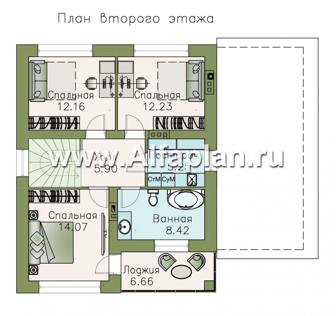 План второго этажа данного коттеджа традиционен - здесь располагаются спальные помещения. Их всего три: большая (родительская) и две поменьше (детские). Последние также можно использовать как гостевые комнаты. Здесь же находится просторный санузел, подразумевающий установку ванной, и постирочная. Из большой спальни можно попасть на лоджию, обустройство которой зависит только от желаний и предпочтений заказчика.