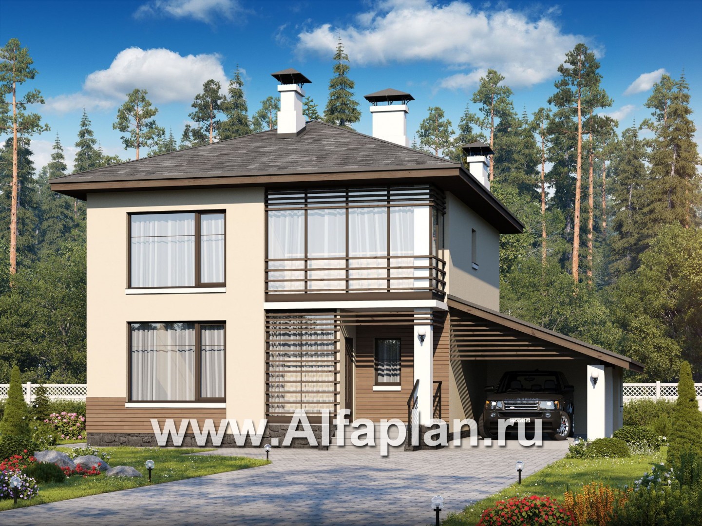 533B-S «Эволюция» - проект двухэтажного дома, с балконом, навес на 1 авто, в современном стиле