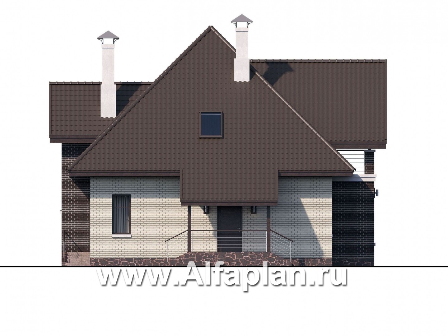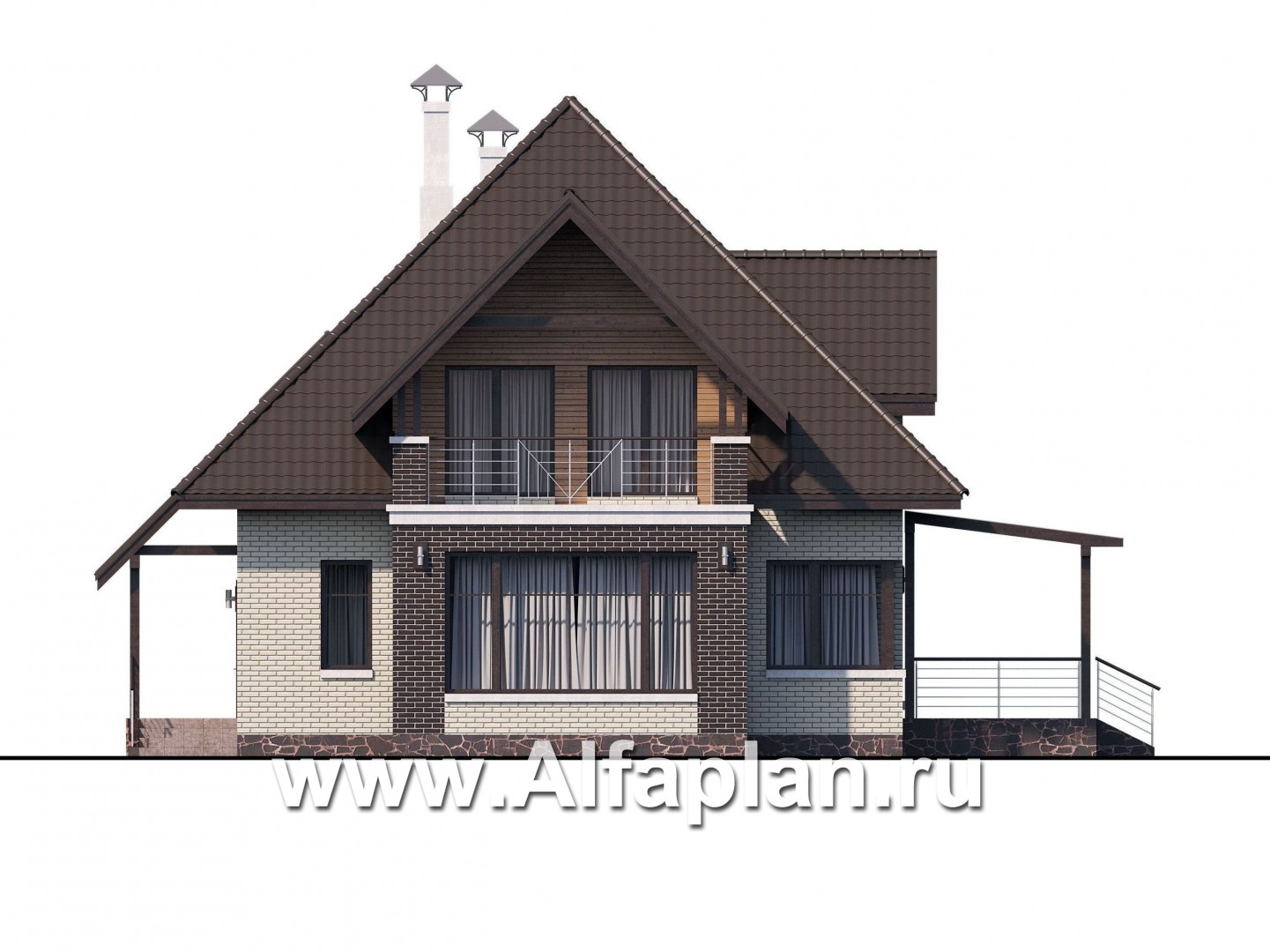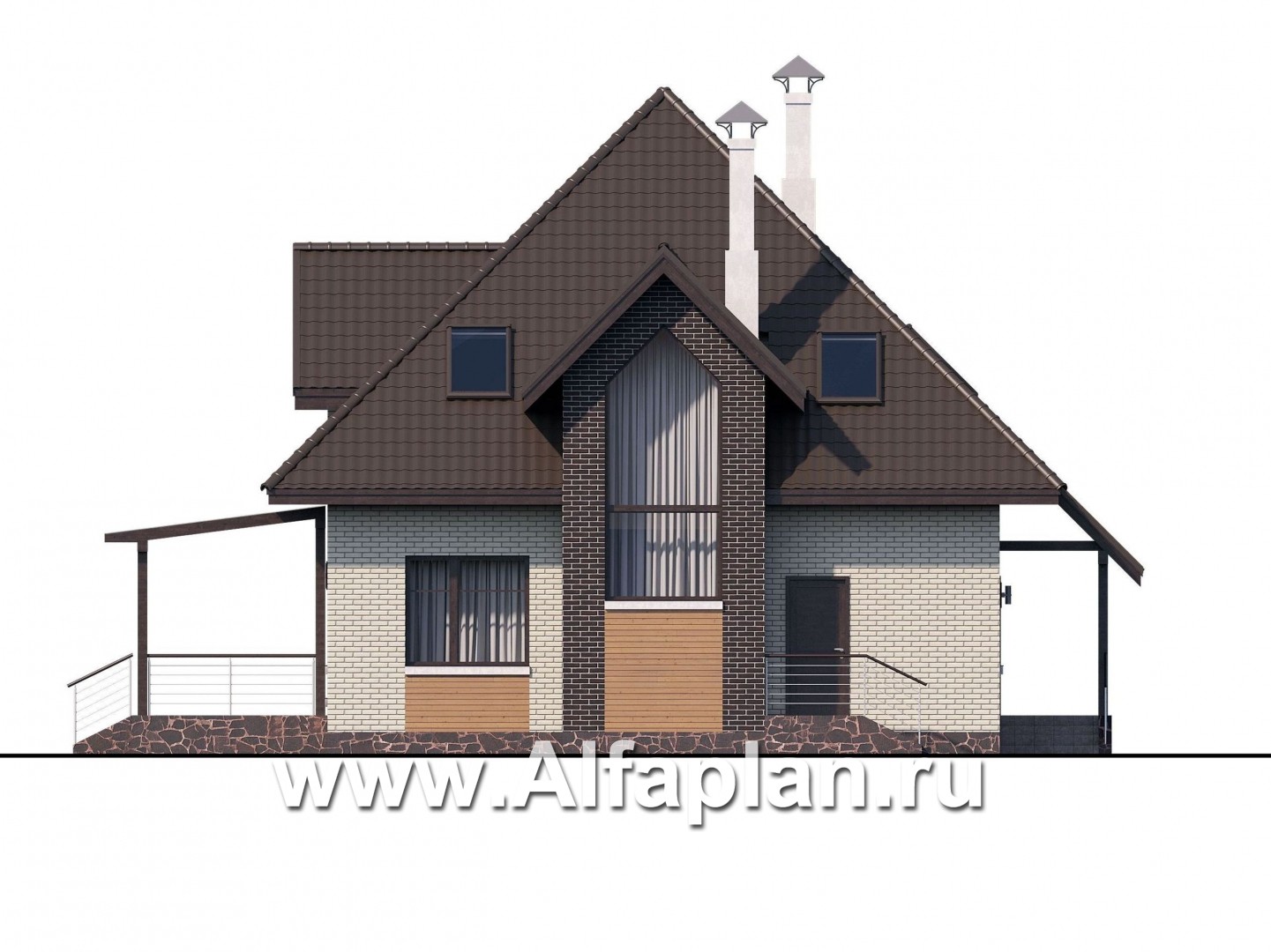 В доме – красивая и высокая пирамидальная кровля, под которой находится мансарда. Фасад облицован кирпичами. Яркий акцент на главном фасаде – панорамное окно гостиной.