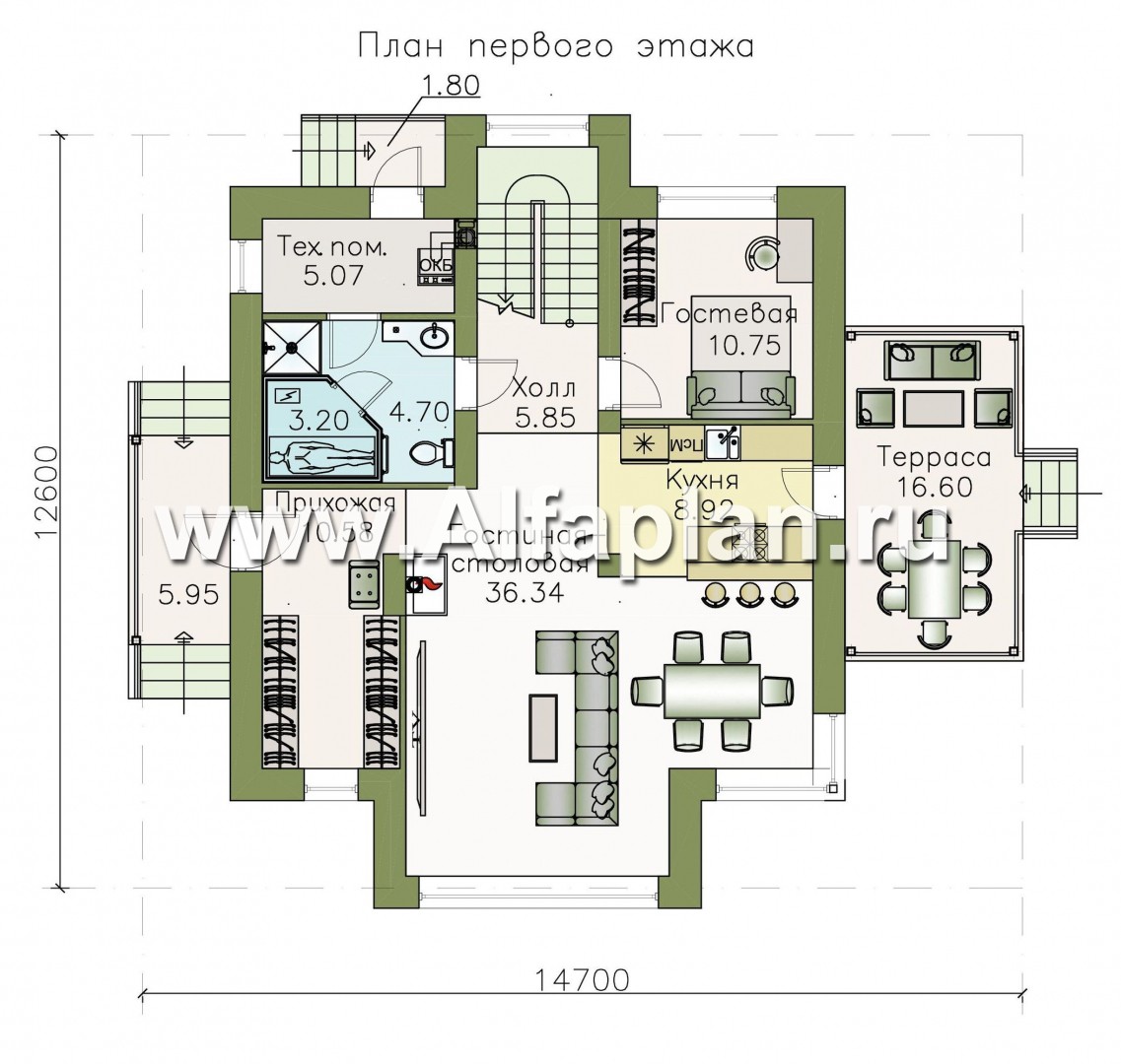 На первом этаже, конечно, запроектированы традиционные помещения гостиной-столовой кухни, перетекающих друг в друга. К кухне примыкает терраса под крышей. Кроме этих традиционных комнат, в доме на первом этаже есть кабинет (или гостевая), а также сауна.