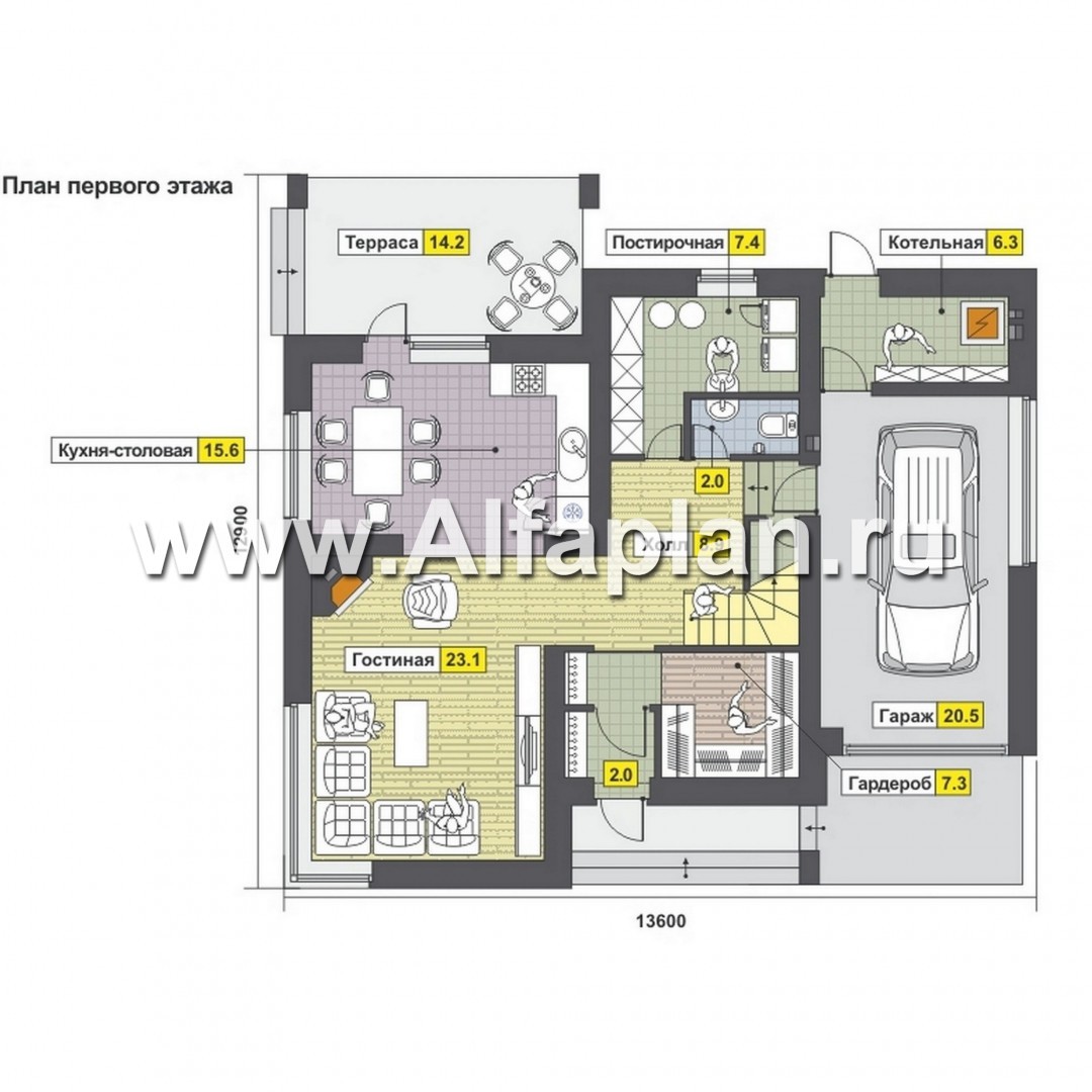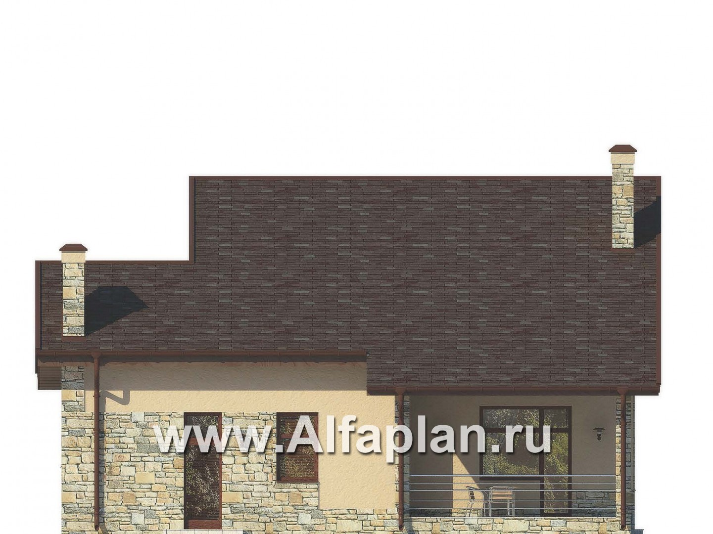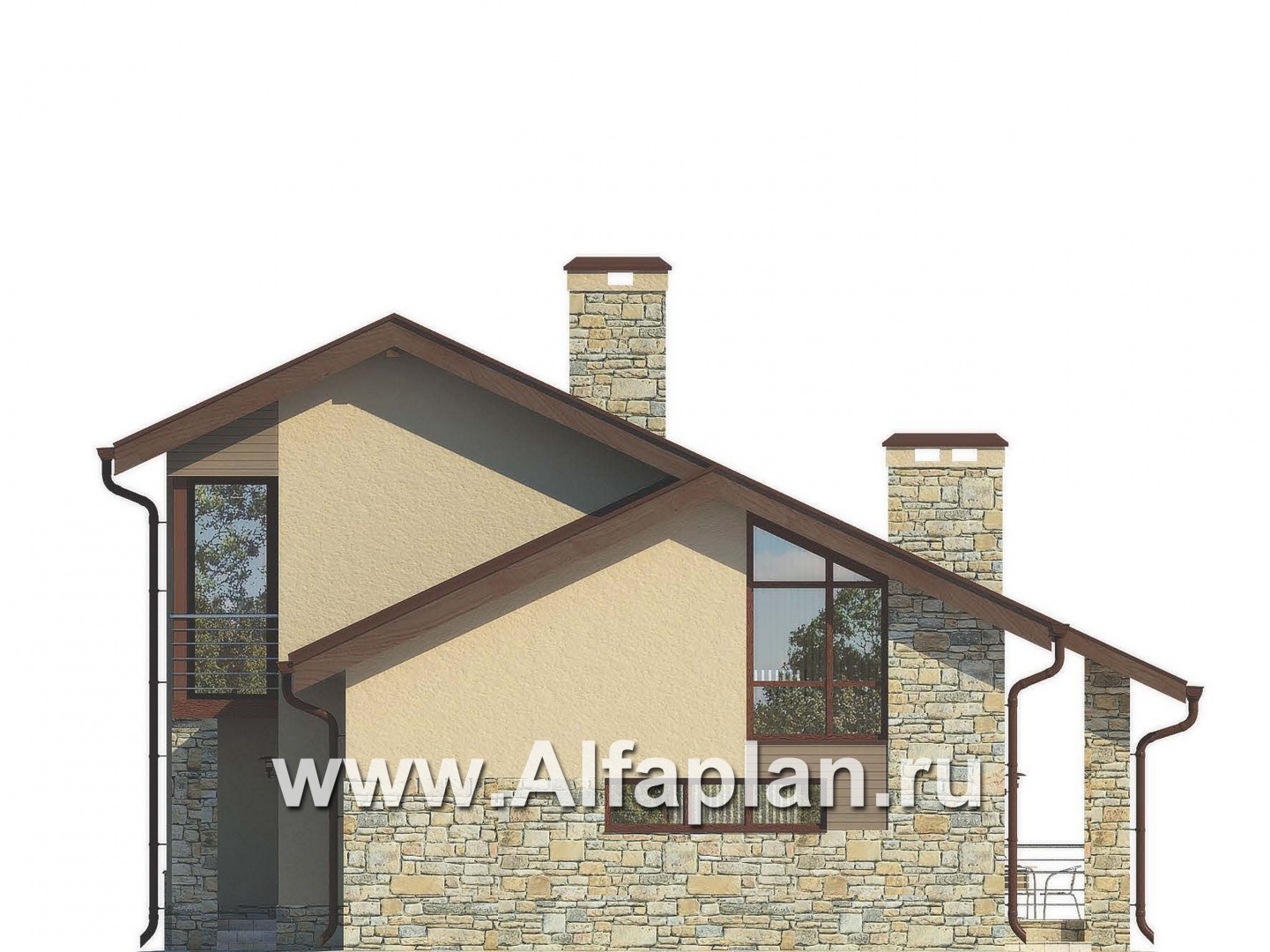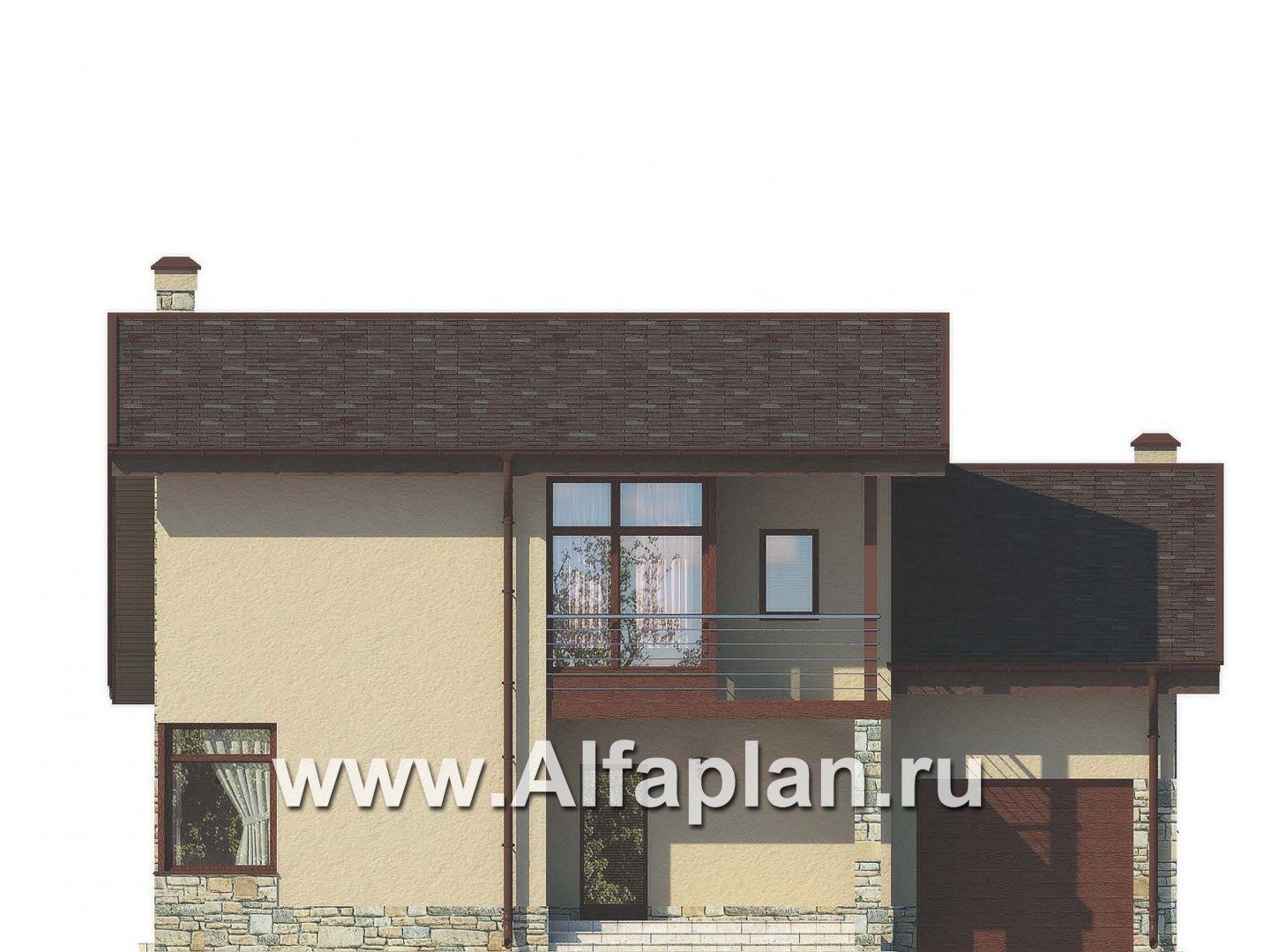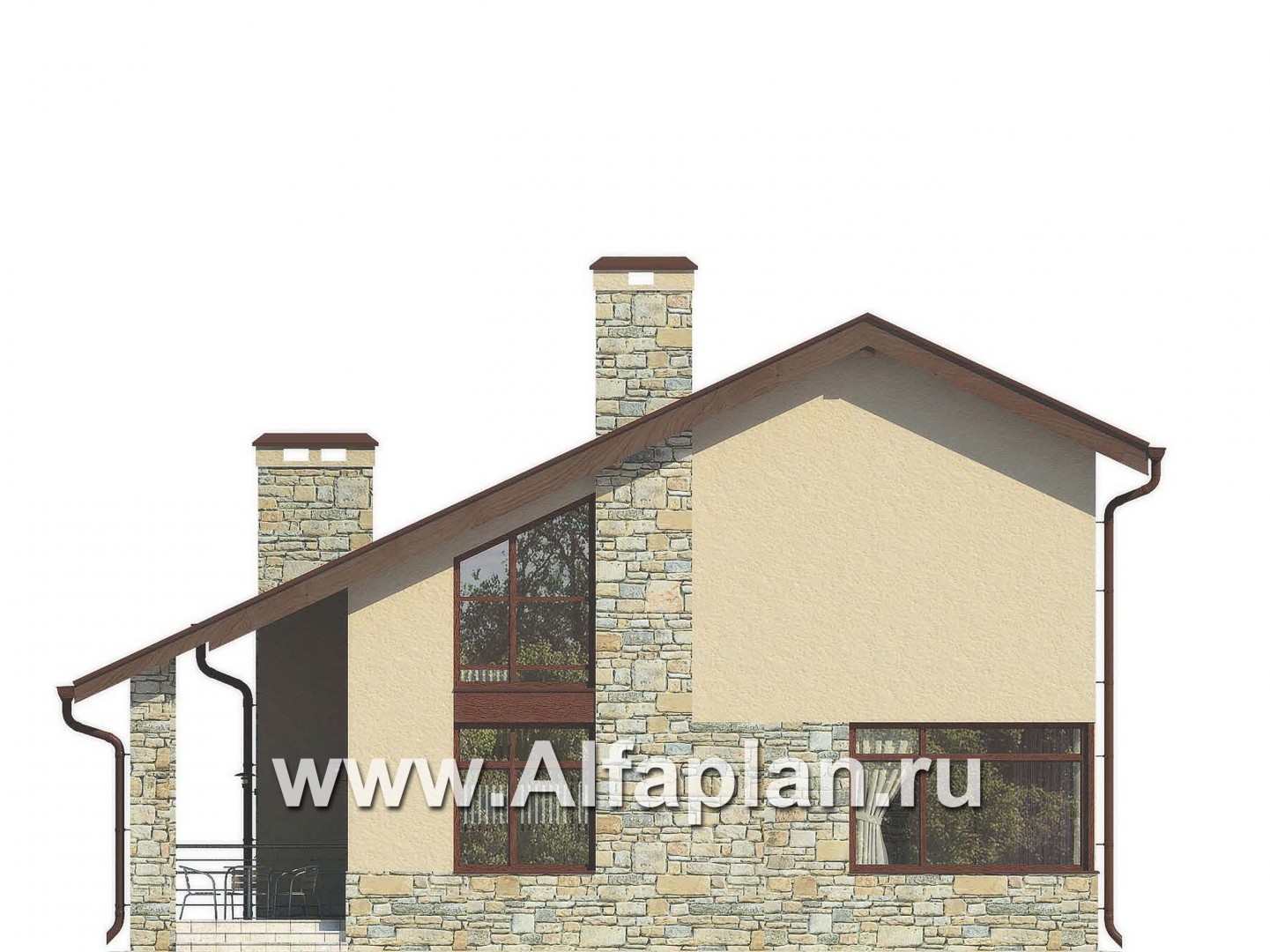 Небольшой по площади, удобный и рациональный по планировке современный загородный дом. Проектом предусмотрены два этажа, подвал и чердак отсутствуют. Рациональное решение, заложенное в проекте дома, позволило на сравнительно небольшой площади получить максимум помещений и создать комфортную среду обитания. Первый этаж условно можно разделить на три функциональные части. В центре находится рекреационная зона с небольшим холлом, гардеробной и лестницей на мансарду. Сюда же выходит и постирочная. Правый пролет занимает гараж и котельная. Гараж удобно связан с жилой частью дома. С левой стороны от холла расположена гостевая зона, объединяющая гостиную и кухню-столовую. Украшением этого пространства по праву является угловой камин. Интересно решено и остекление гостиной с большим угловым витражом. Мансардный этаж очень рационально продуманная и в тоже время комфортабельная спальная зона. Каждая из расположенных здесь трех спален имеет свою гардеробную, а спальня хозяев еще балкон и ванную комнату. Еще одна просторная и светлая ванная рассчитана на две другие спальни.
